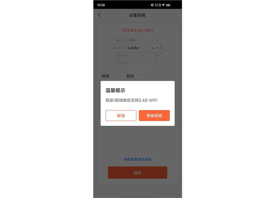 The control terminal APP adds a power-on socket. The following prompt is seen in the network setting link, which means that the WiFi currently connected to the mobile phone is not 2.4G channel. Please change the network and try again.