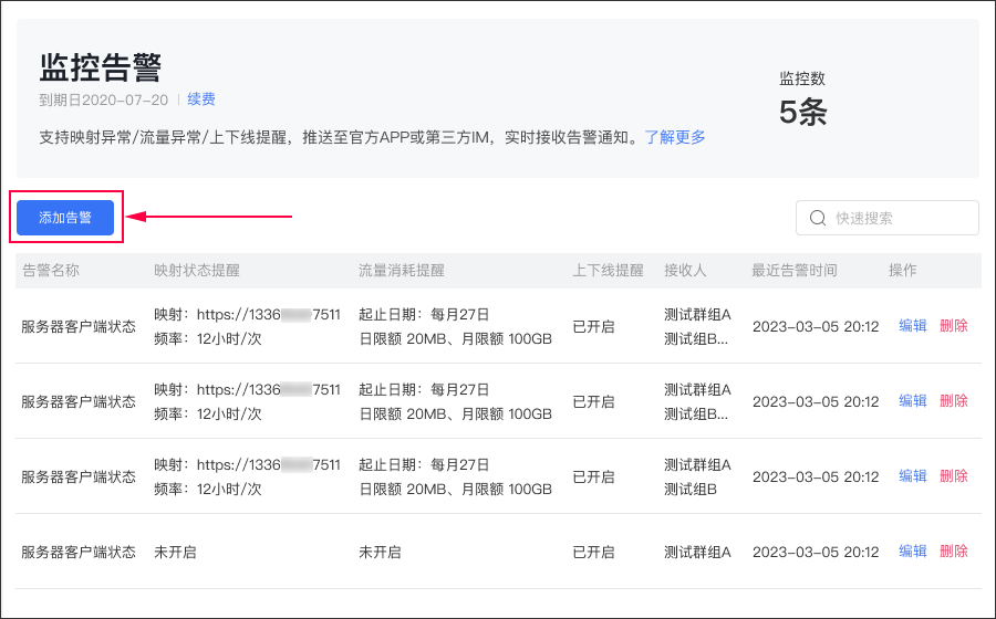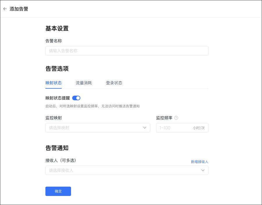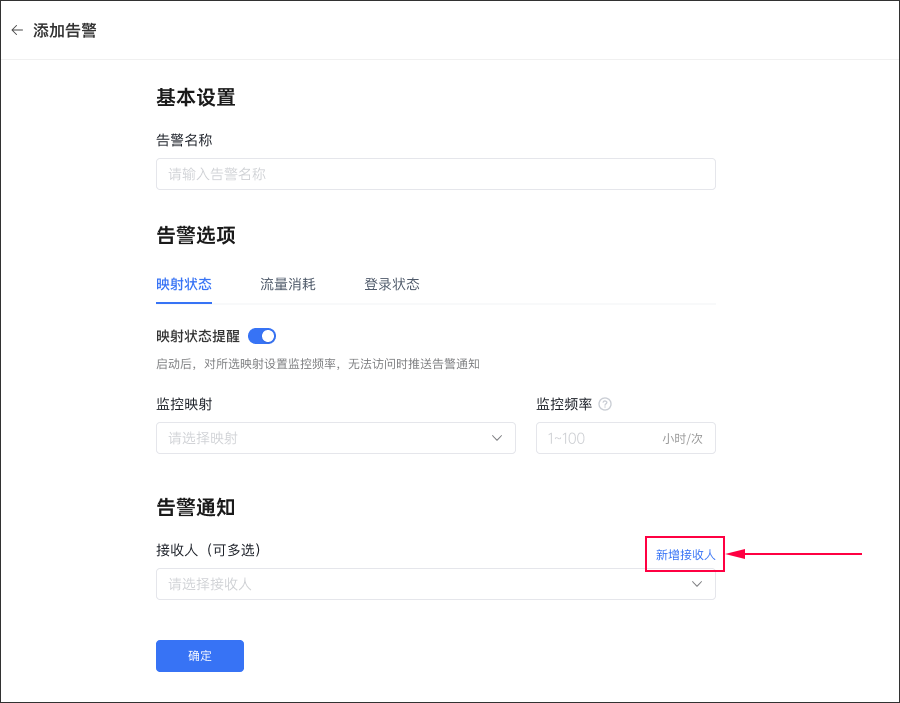 ! * * Enter Add Alarm. After filling in the alarm name, the alarm options will be set. There are 3 alarm options: mapping status, traffic consumption and login status * *.
