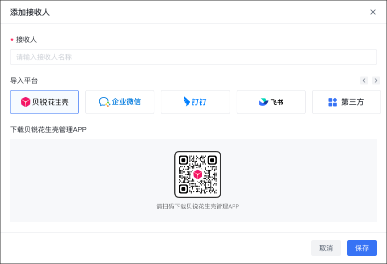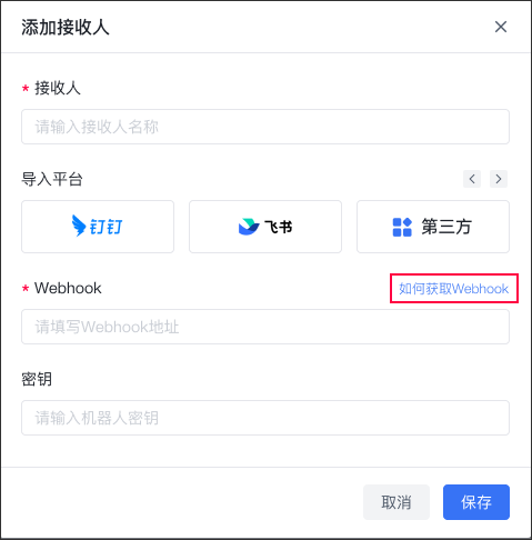 (2) After filling in the name of the recipient, select the receiving platform. Aweshell alarm notification supports multiple platforms to send alarms: Aweray Aweshell management APP, enterprise WeChat, DingTalk, Feishu and third-party platforms. ! ! * * Note: Use platforms other than Aweshell management APP for alarm push, and fill in the Webhook and key to add. Different receiving channels, access to Webhook vary. After selecting the receiving channel, please click [How to Obtain Webhook] on the right side of the pop-up window to view the tutorial on obtaining Webhook.** !