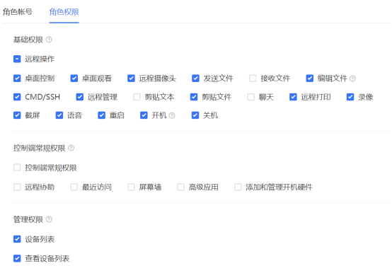 In addition, enterprises also support different roles to grant different remote control function permissions. This function can help enterprises standardize the specific behaviors of personnel in different positions during remote office work, including file transmission direction settings (sending, receiving and editing files), clipping text/files, remote control menu function settings (chat, remote printing, video recording, screen capture and other functions), restart, shutdown, startup and other options.