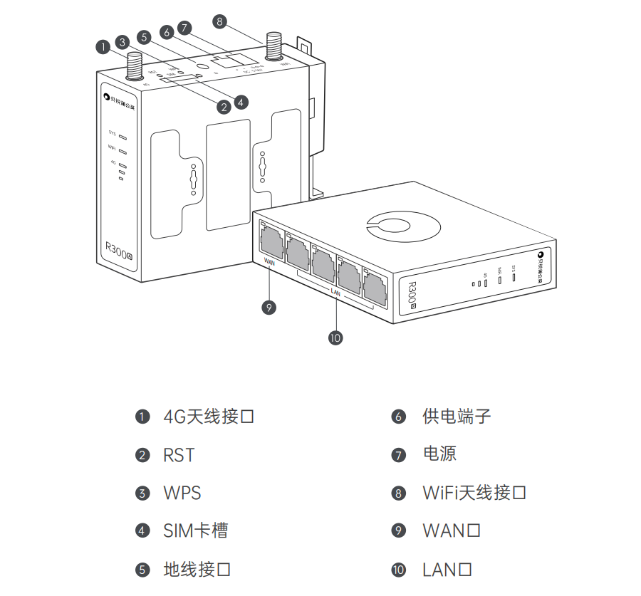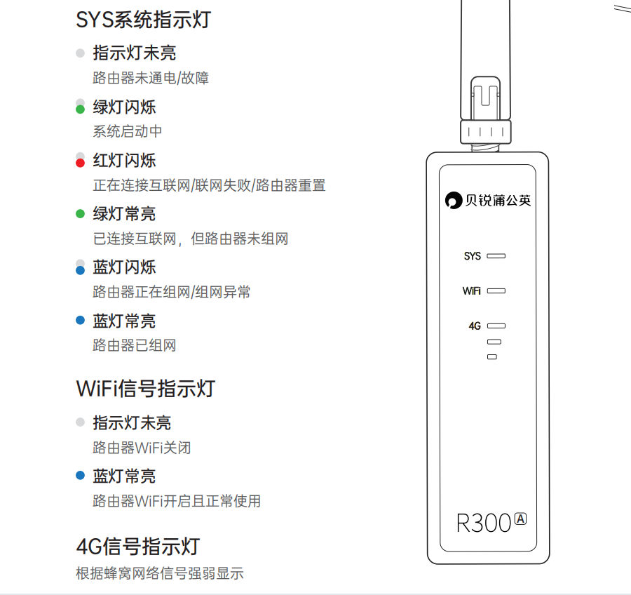 蒲公英R300A為例,前面板有三種類型的指示燈,分別為SYS系統指示燈、WIFI信號指示燈以及4G信號強弱燈,詳細介紹如下圖所示: !