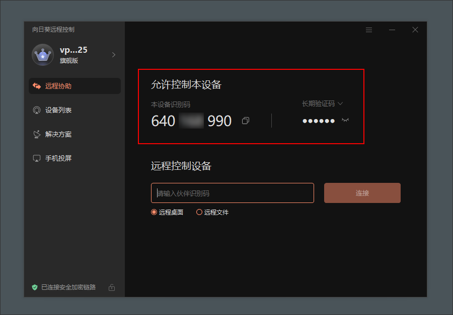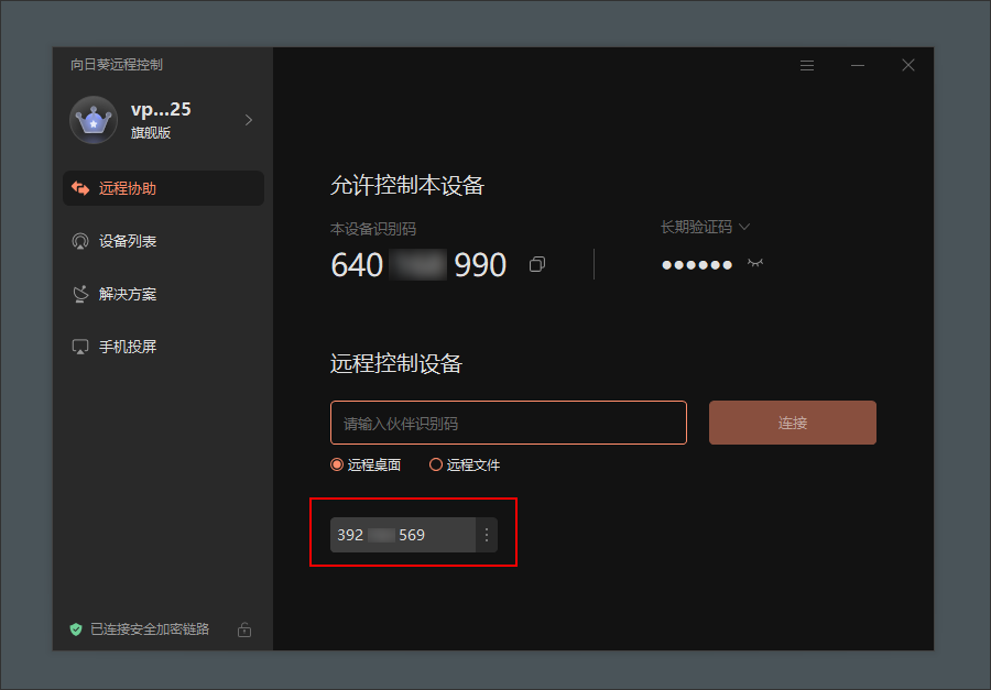 (1)在【遠程協助】->【遠程控制設備】欄中,輸入被控設備的識別碼; !