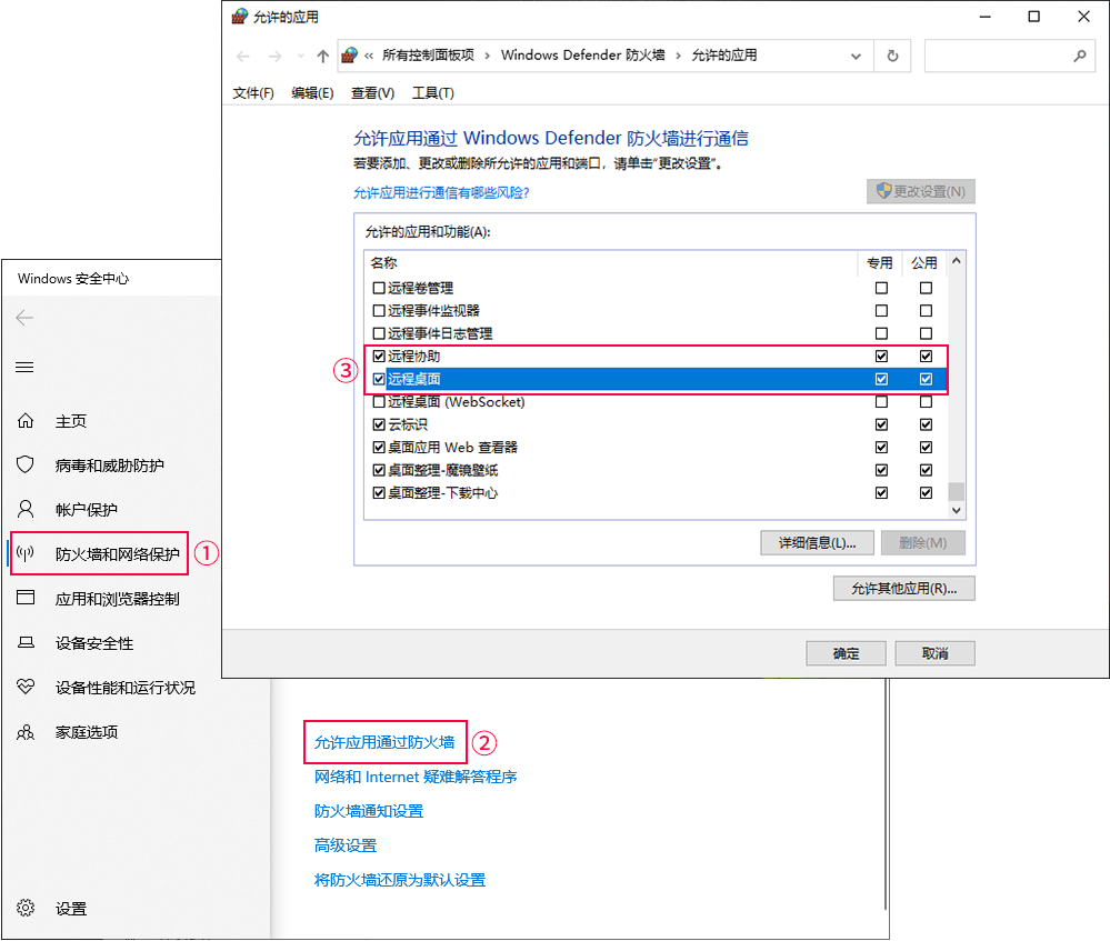 (5)若遠程桌面功能已確認開啟了,但局域網內其他設備無法連接進來,可以檢查電腦的防火牆是否允許遠程桌面的訪問。 ①進入路徑:【Windows設置】->【更新和安全】->【Windows安全中心】->【防火牆和網絡保護】->【允許應用通過防火牆】 ②點擊右上角的「更改設置」,在允許的應用和功能窗口中,確認已經勾選了「遠程協助」和「遠程桌面」兩項 !