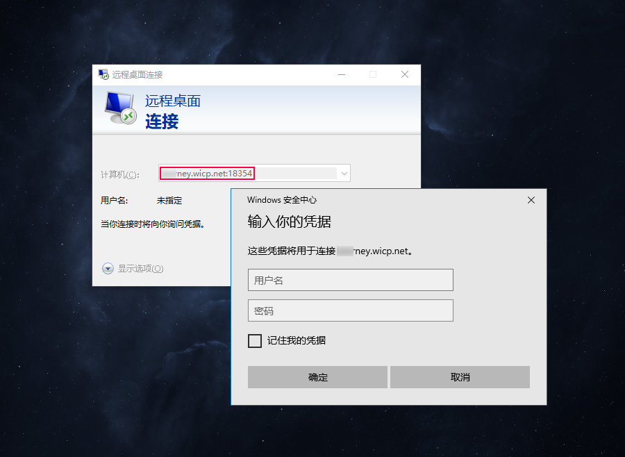 (1)此時我們找一台外網電腦測試訪問,在任務欄搜索框中,輸入命令「mstsc」並回車,調出遠程桌面連接窗口。 (2)在計算機地址欄中輸入花生殼映射生成的外網訪問地址(域名+端口),點擊「連接」(注意:切記不要漏了域名後面的冒號與端口號,否則會連不上遠程桌面)。 然後輸入遠程計算機的用戶名和密碼,點「確定」。 !