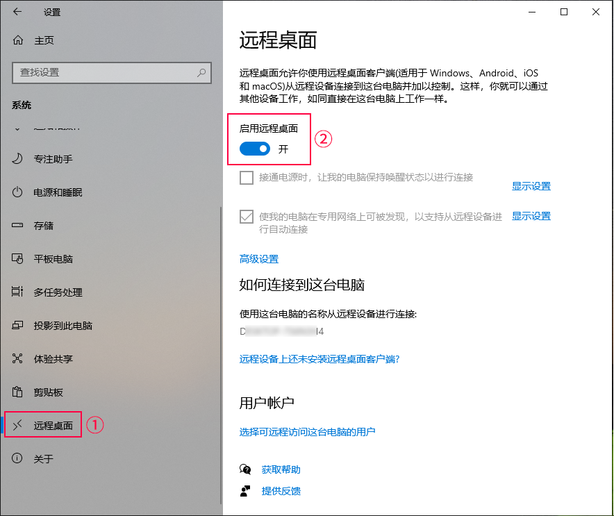 (2)在設置主頁的右側功能中,選擇【遠程桌面】->【啟用遠程桌面】的開關。 !