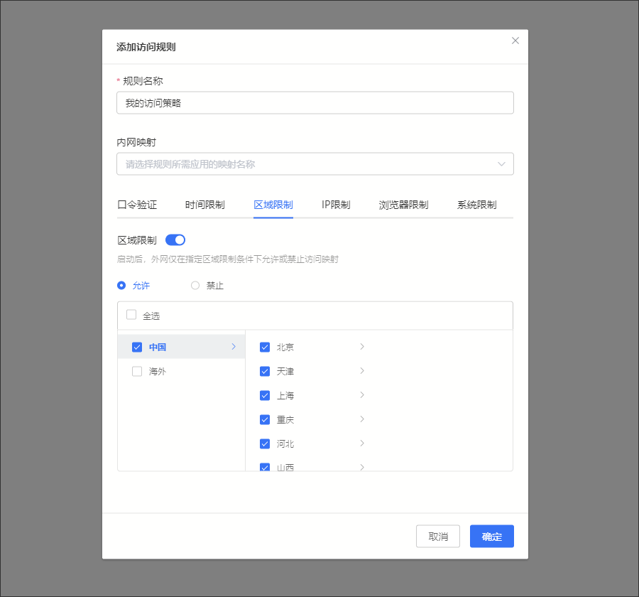 | 區域限制 | 設置在指定區域限制條件下,所選定的映射才允許/拒絕被訪問,精確到市級 允許:允許勾選的區域的外網訪問映射 禁止:禁止勾選的區域的外網訪問映射 舉例場景:只允許中國區域的網絡訪問映射 |