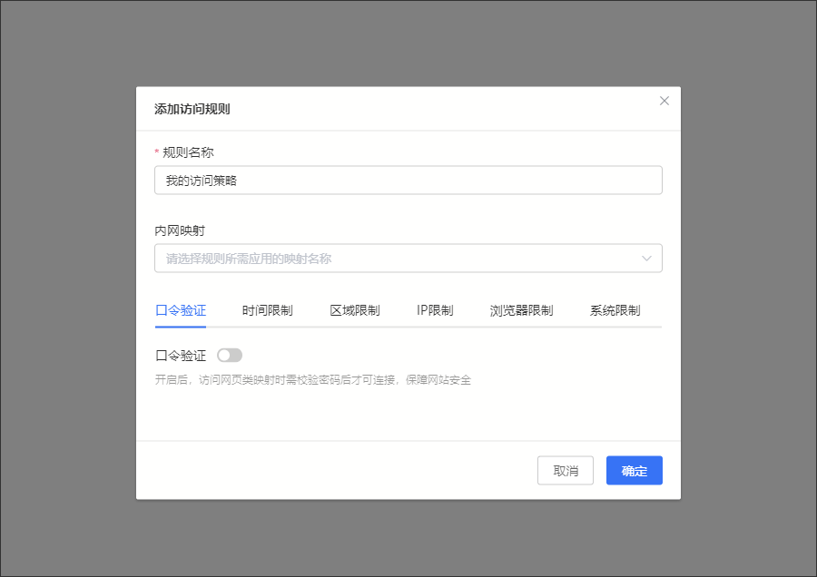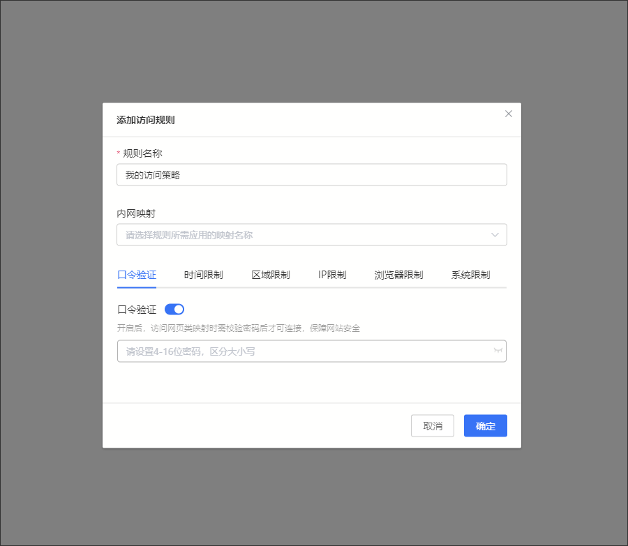 | 口令驗證 | 開啟口令設置密碼後,訪問網頁類映射時需要校驗密碼後才可連接,保障網站安全 |