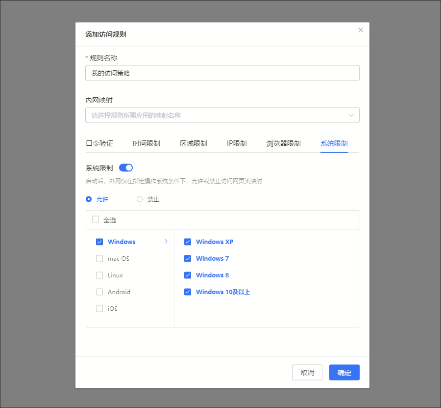 | 系統限制 | 與瀏覽器類型版本同理,部分操作系統版本也有可能存在安全風險,可設置在指定操作系統(Windows/macOS/Linux/Android/iOS)及版本的限制條件下,所選定的HTTPS映射才允許/拒絕被訪問 允許:只允許指定的系統及其指定版本訪問映射 禁止:針對已知存在風險的系統類型及版本,劃為黑名單,禁止訪問映射 舉例場景:僅允許使用Windows操作系統訪問映射 |