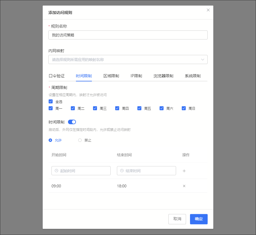 | 時間限制 | 單選擇設置在指定時間段內,所選定的映射才允許/拒絕被訪問,最多支持添加5個時間段;可結合周期限制精細化使用 允許:允許指定時間內訪問映射 禁止:指定時間內禁止訪問映射 舉例場景:上班時間09:00-18:00期間才允許訪問辦公系統,其餘時間禁止訪問 |