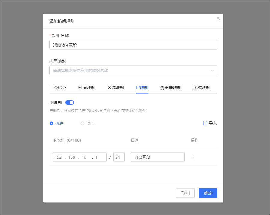 ! 注意: ①IP地址段最多可添加100條記錄; **②需設置多條IP地址記錄,點擊「導入」,可按引導步驟進行批量添加。 **