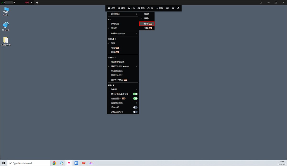 適用條件: 1.主控端使用合屏模式及分屏模式,需瓜子會員及以上級別【點擊購買】 ; **2.使用合屏模式及分屏模式,主被控需安裝使用Windows個人版V13.2及以上版本軟件。 ** ! 首次遠程控制多屏設備,系統檢測到被控端有多屏幕顯示,則自動彈出提示進行選擇對應的顯示模式,可選「單屏模式」、「合屏模式」、「分屏模式」。 !