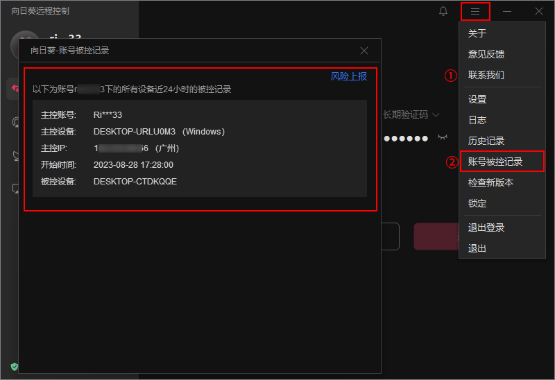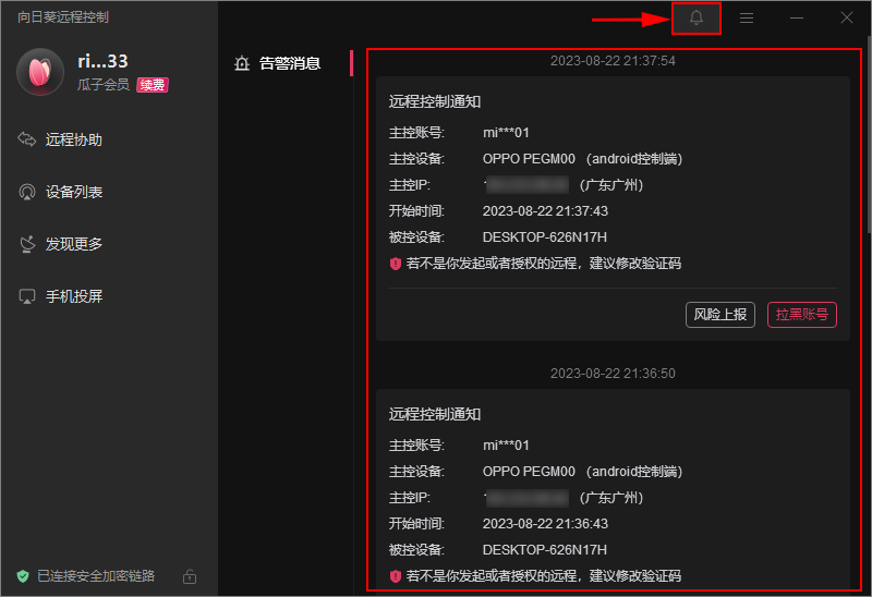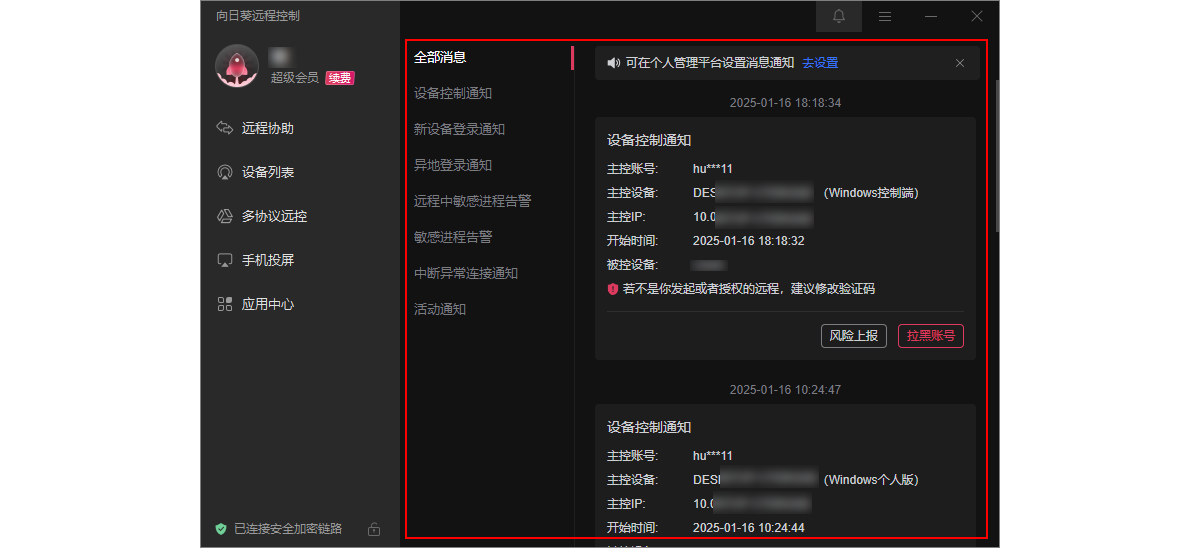 對於已開展的遠控事件,我們可以查看遠程操作的記錄,便於事後追溯,確認是否存在可疑或未經授權的遠控。 (1)點擊向日葵主頁面的消息中心,能夠查看所有的歷史告警信息,並可對可疑賬號進行拉黑,或是進行上報,和向日葵一起共創良好安全的遠控環境; !