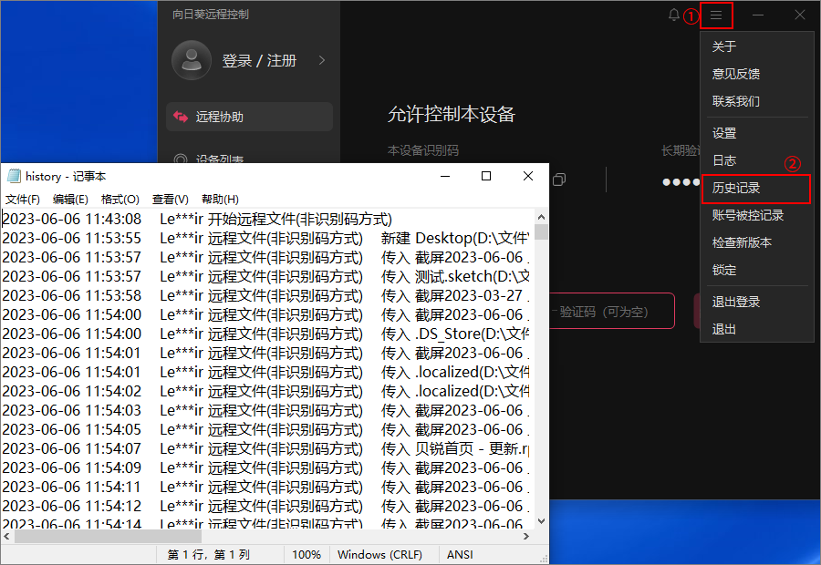 (3)操作路徑:【三】->【歷史記錄】 可查看本機被控記錄,包括遠程文件等操作記錄。 !