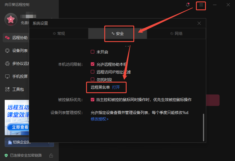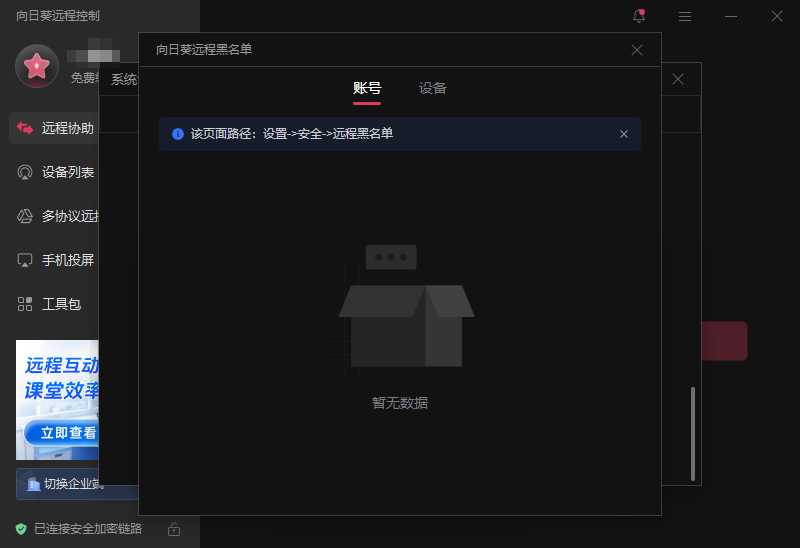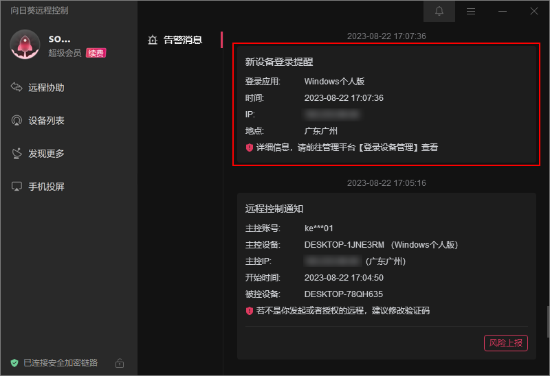 通過上面提到的告警通知,我們可以通過手機APP或者桌面客戶端遠程中斷您認為可疑的遠程控制,掌握主動權。 (1)手機APP與桌面客戶端的【消息中心】界面也可以同步接收到對應的告警信息,如發現非自主發起的可疑遠控,或未經授權的遠控事件,我們能夠直接通過桌面客戶端、移動版控制端App,快速中斷遠控。 ! (2)除了中斷遠控,我們還可點擊「拉黑賬號」,禁止對方再次發起遠控,阻止可疑賬號的騷擾,並且可進一步上報反饋,和貝銳向日葵共創良好安全的遠控環境。 ! (3)如果想查看已經拉黑的賬號/設備,或者想將拉黑賬號放出來,可以進入【設置-安全】,打開遠程黑名單。 ! 圖片alt