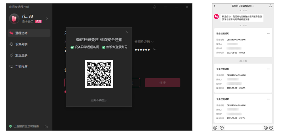 (2)當我們接受識別碼遠控時,向日葵同樣提供了多個渠道的遠程控制行為通知告警,會第一時間收到對應的通知,包括微信公眾號、手機APP、桌面客戶端。 以微信公眾號為例: 登錄貝銳賬號(在向日葵軟件/網站註冊的賬號)後,會彈出掃碼綁定微信通知的窗口,掃碼即可綁定微信公眾號,接收對應通知。 !