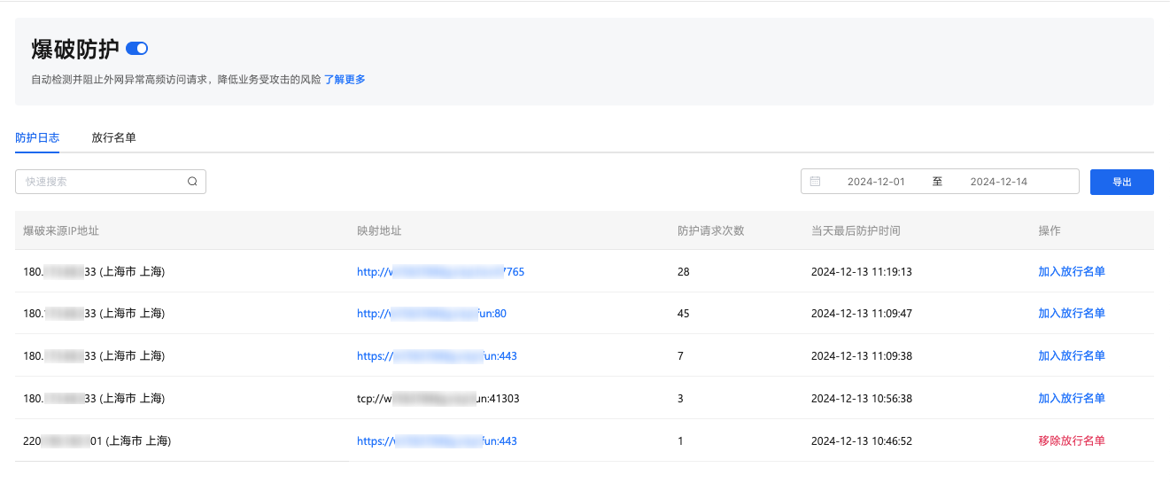 智能識別:精確識別爆破行為,減少誤判 實時保護:不間斷監控,實時攔截潛在的爆破攻擊 靈活控制:自定義黑名單和白名單,適應不同業務需求