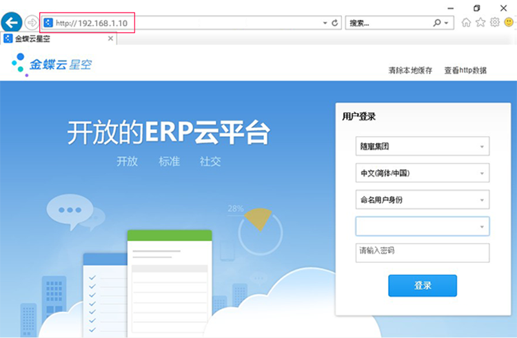 業總部需在服務器部署金蝶辦公系統,並確保局域網內的設備通過服務器的內網IP,在本地能夠訪問成功。 下圖為網頁版金蝶辦公系統,辦公系統內網訪問的IP:192.168.1.10,端口號:80。 !