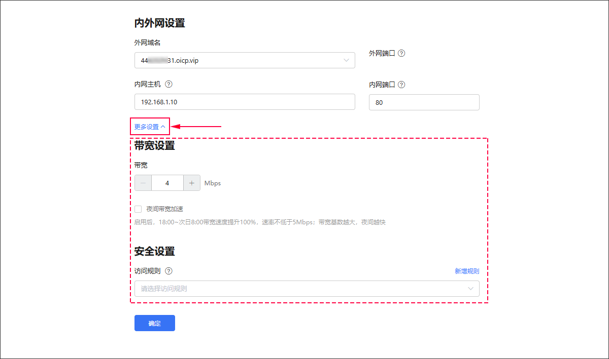 若有帶寬或安全需求,可點擊【更多設置】進行相關設置。