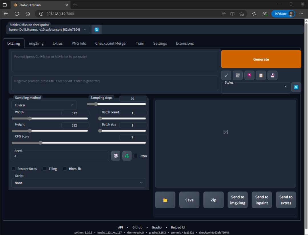 本地快速部署Stable Diffusion web UI,並確保局域網內的設備通過內網IP,在本地能夠訪問成功。 下圖為Stable Diffusion web UI,本地訪問的IP:192.168.1.10,端口號:7860。 !