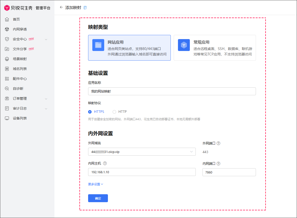 | 映射設置 | 網站應用 | 適合網頁類站點,支持80/443端口外網通過瀏覽器輸入域名即可直接訪問 |