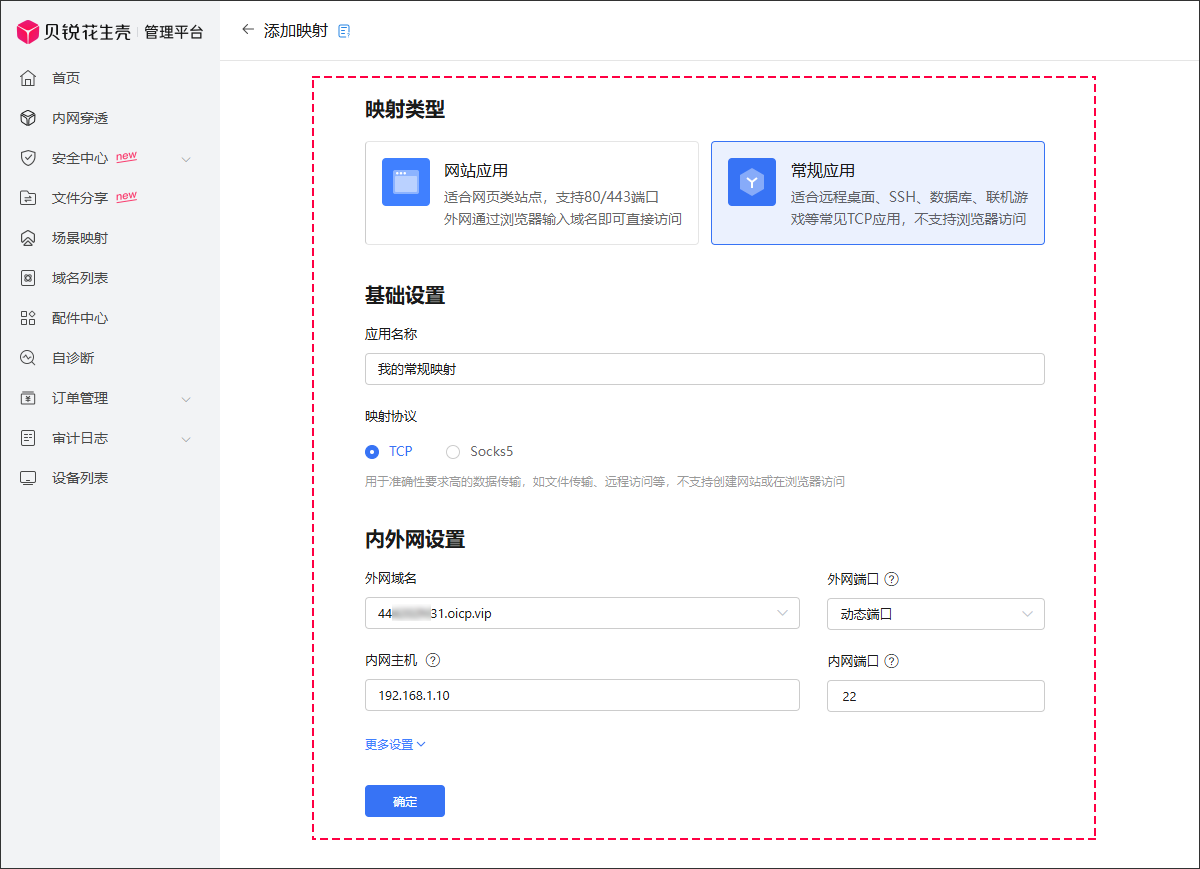 | 映射設置 | 常規應用 | 適合遠程桌面、SSH、數據庫、聯機遊戲等常見TCP應用,不支持瀏覽器訪問 |