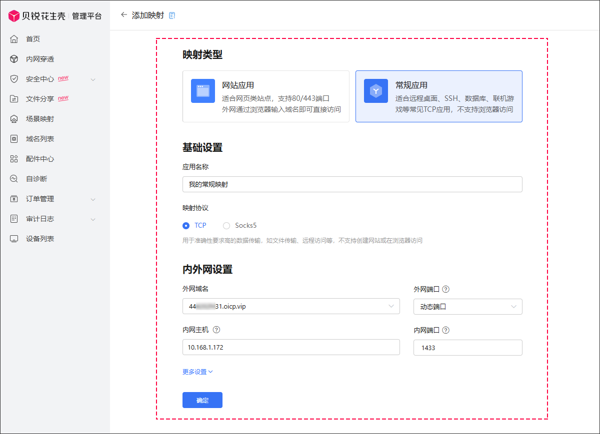 | 映射設置 | 常規應用 | 適合遠程桌面、SSH、數據庫、聯機遊戲等常見TCP應用,不支持瀏覽器訪問 |